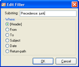 Define string and location where to search this string. The program can search substrings in the next message's fields: From, To, Subject, Date, Return-Path. Searching in entire header is also available (select [Header] for this).